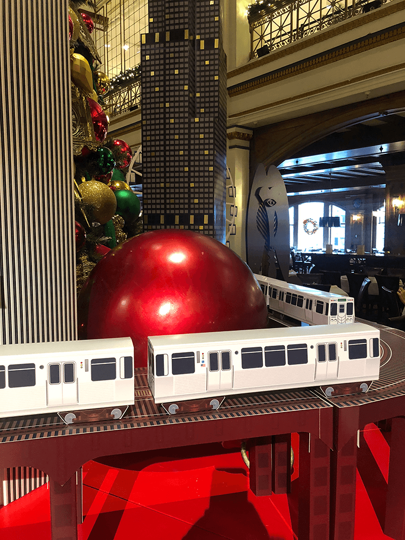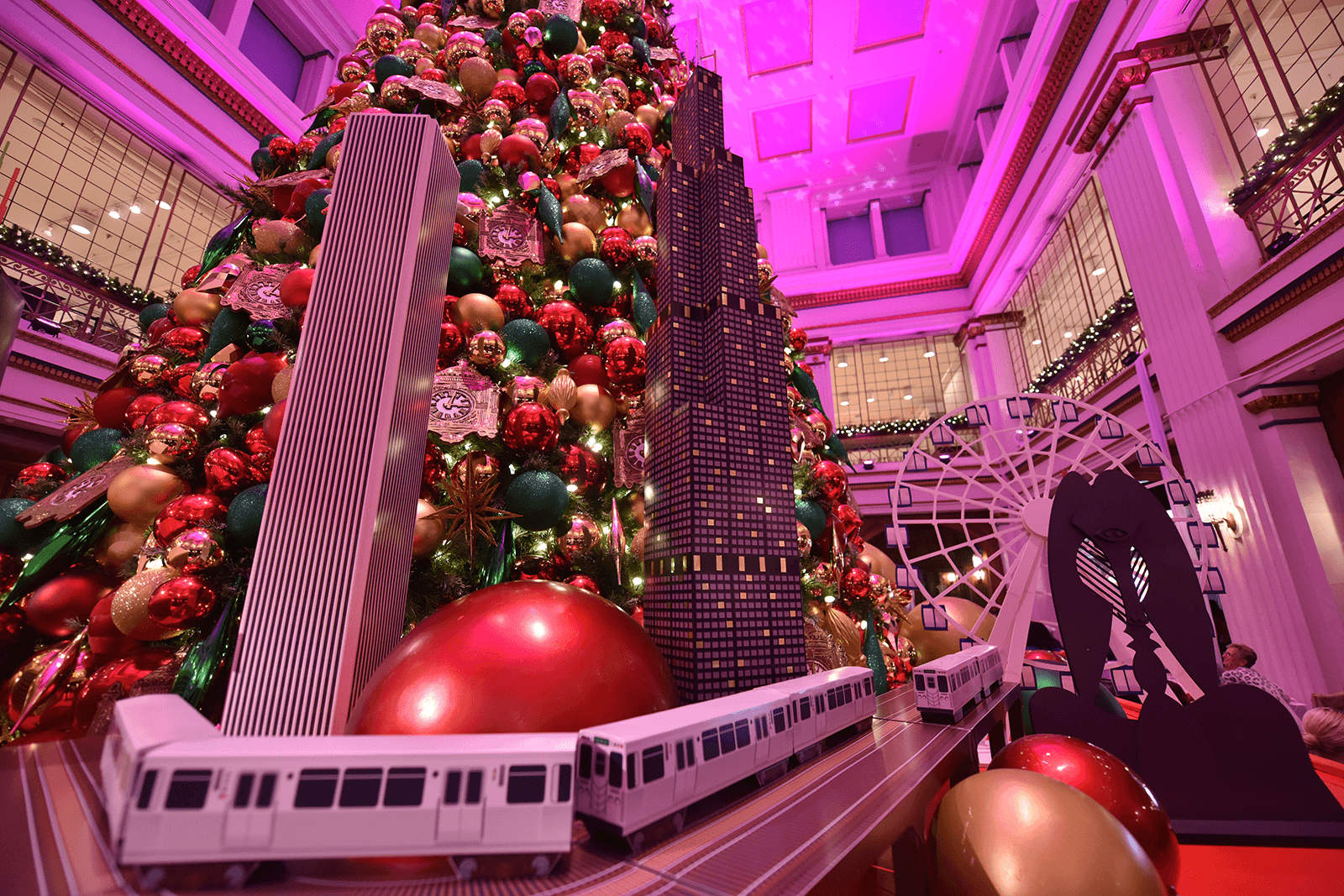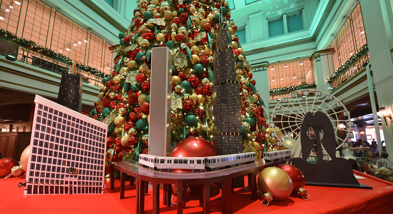 The exhibit is open from now until January 5th with varying holiday hours throughout the season. Visit The Walnut Room and check out our Chicago skyline as well as the other extravagant decorations on display!